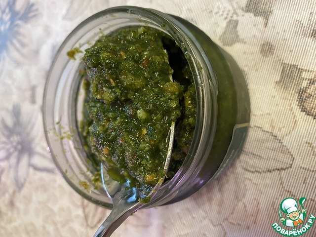 У меня получилось 1,5 литра этой приправы. Т. к. она соленая, добавлять ее нужно понемногу. Этого хватит на зиму. Она не портится.