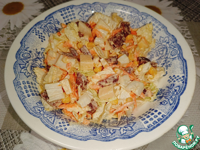 Очень вкусный салатик с сухариками. И прост в приготовлении.