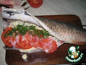 Итак, рыбу чистим, освобождаем от внутренностей. Отрезаем нашей рыбке голову и хвост (если позволяют размеры духовки и посуды - хвост можно оставить), натираем хорошенько солью и молотым перцем, обильно поливаем соком лимона -