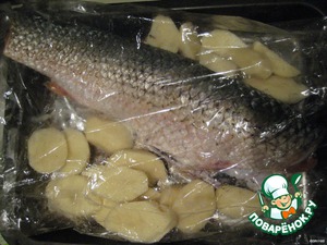 Сладкий перец режем крупно, помещаем рыбу в рукав, обкладываем картофелем, кусочками перца и оставшимися дольками помидора