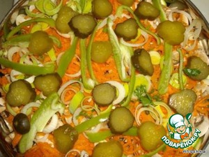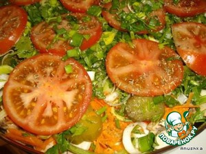 Все овощи порезать кружочками. Морковку потереть на терке. Траву измельчить.