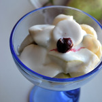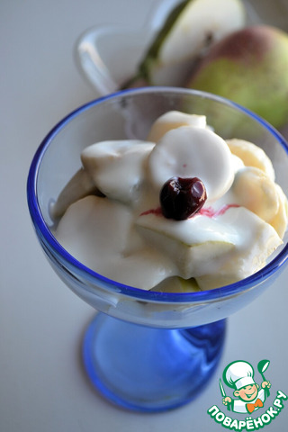 Режем мелкими кусочками яблоко, грушу. Банан нарезаем кружочками, добавляем размороженную вишню. Все хорошо перемешиваем, заливаем сверху йогуртом (чуть-чуть оставьте для украшения), опять перемешиваем. Теперь выкладываем в красивые бокалы (или на тарелку), сверху заливем остатками йогурта, посерединке кладем вишенку.