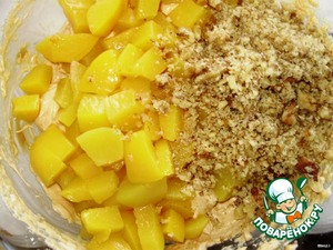 Для крема масло сливочное взбиваем со сгущенкой вареной, добавляем сок от персиков консервированных - масса должна получиться эластичной и однородной, затем добавляем в крем персики, нарезанные кубиком, и измельченный грецкий орех, все перемешиваем.