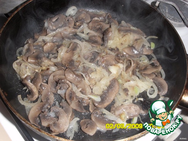 Шляпки от грибов нашинковать, потушить в сковородке |