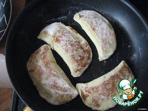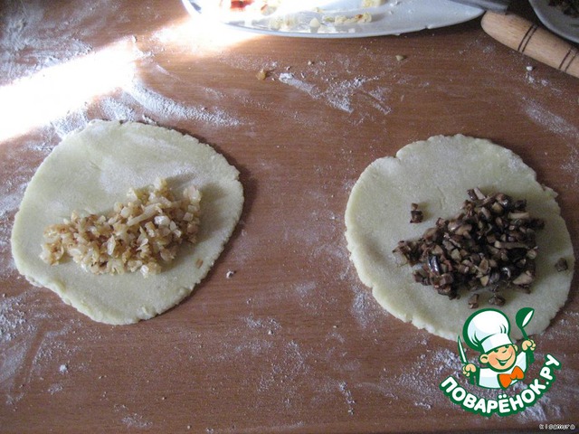 Насыпать на стол чуть-чуть муки, раскатать лепёшечки, выложить начинку и закрыть как чебуреки или вареники.