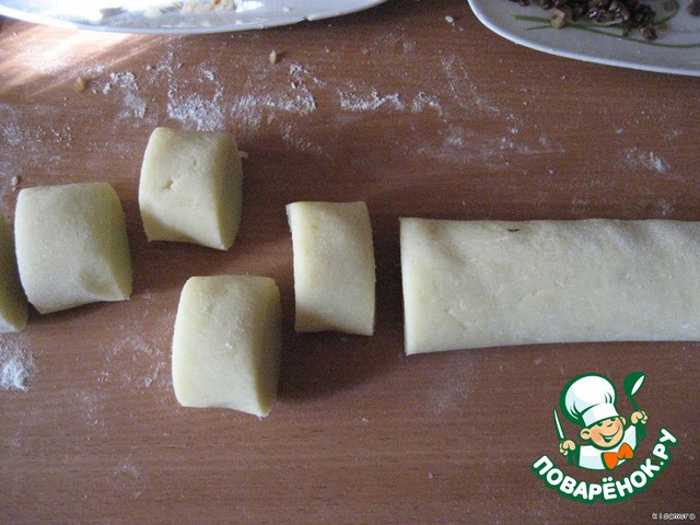 Остывший картофель 3 раза (не меньше) смолоть на мясорубке, вымесить, раскатать в колбаску и нарезать на кусочки (если масса рассыпается, то придётся добавить муку и яйца)