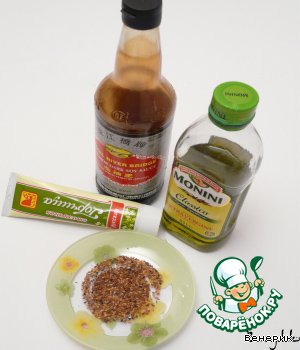 Для соуса смешиваем оливковое масло, горчицу, соевый соус и выжатый чеснок.