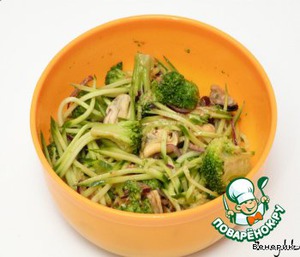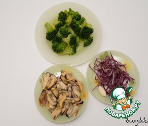 Отварить мидии, нарезать полукольцами репчатый лук. Брокколи вымыть, разобрать на небольшие соцветия и отварить в кипящей подсоленной воде, 5 мин. Отбросить на дуршлаг и сразу же переложить на 2 мин. в ледяную воду.