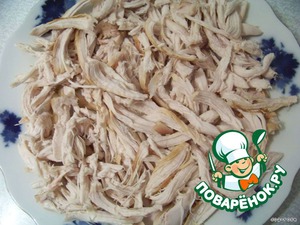 Отвариваем куриное филе в подсоленной воде. Охлаждаем и мелко режем (или разбираем на волокна).
