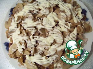Вкусный праздничный слоеный салат. Делать лучше за день до подачи. Если положить лесные грибы, а не шампиньоны, то курочка будет совсем лесная!