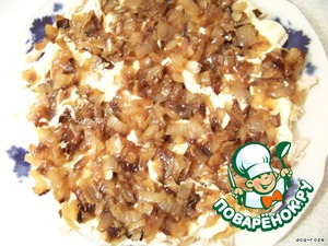 Луковицы режем некрупными кусочками, обжариваем, охлаждаем. Выкладываем слой лука.