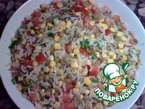 Рис моем и отвариваем в кипящей, чуть-чуть подсоленной воде до готовности. Промываем холодной водой, даем стечь и отправляем в салатницу.