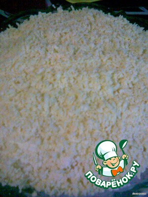 Третий слой - сыр, тертый на крупной терке, и майонез