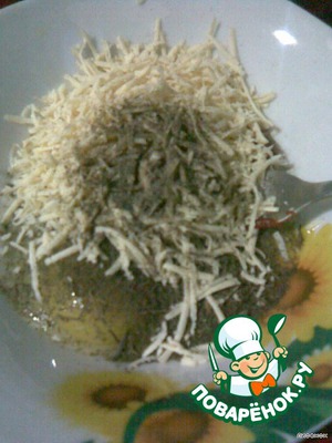Готовим панировку: сыр натереть на средней терке и смешать с яйцами, томат-пастой, зеленью, специями и маслом растительным