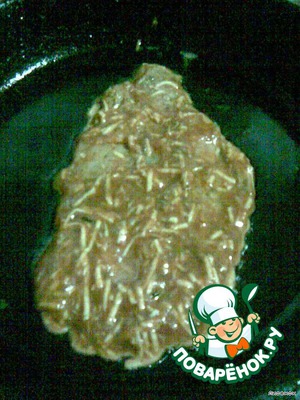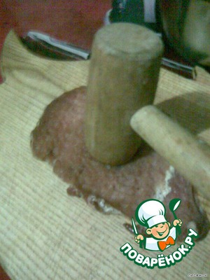 Когда время маринования мяса вышло, отбиваем его (лук я не использовала, но по желанию его можно измельчить и добавить в панировку)