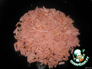 Нарезать ветчину соломкой, выложить на блюдо - первым слоем.