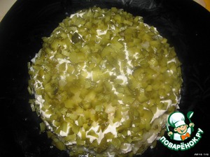 Нарезать мелко корнишоны. Выложить следующий слой.