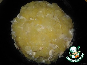 Далее ананас, нарезать мелко, и слить лишнюю жидкость. Я его отжала. Немного майонеза. Соль, перец - по вкусу.