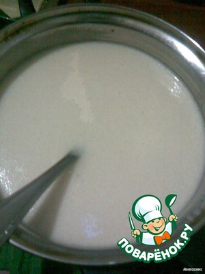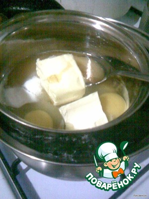 Все продукты для теста (кроме муки) - в одну емкость, ставим на водяную баню и, непрерывно помешивая, варим 5-7 минут.