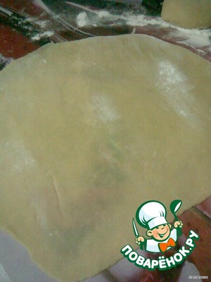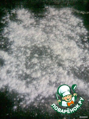 Противень (сухой) пересыпаем мукой, выкладываем корж и выпекаем при температуре 200*C буквально 5-7 минут