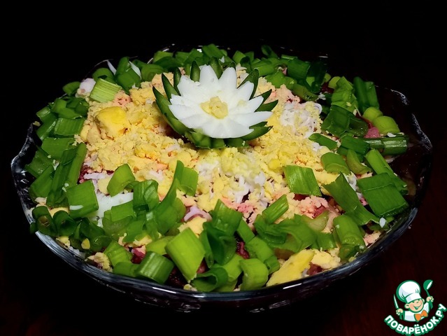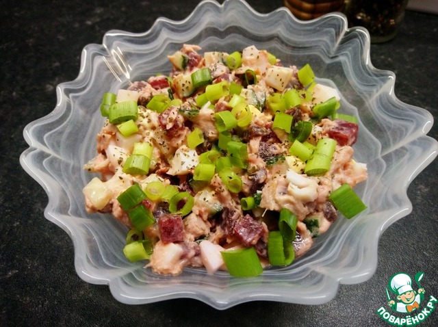 Добавляем нарезанный кубиками огурец и рубленый зеленый лук, перемешиваем. Если хотите более сытный салат, можно добавить вареных яиц, или даже картошки.