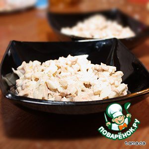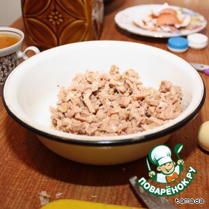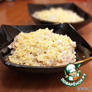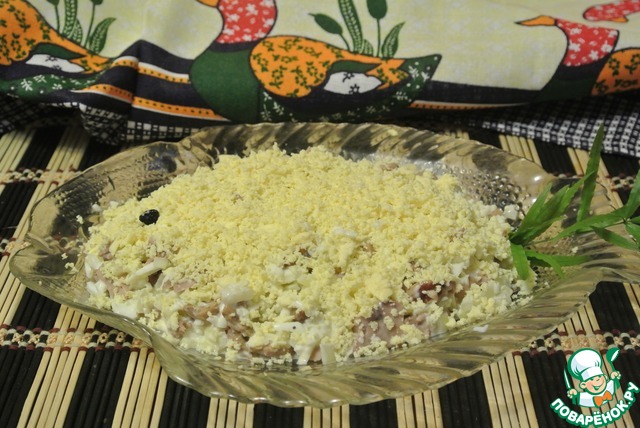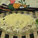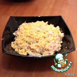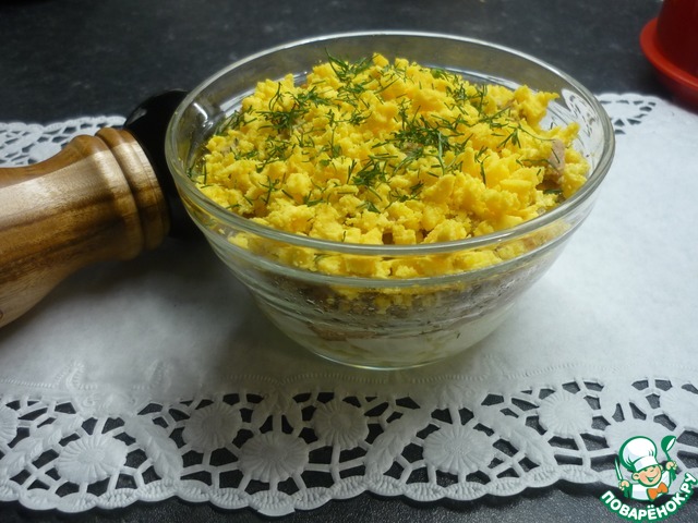 У нас остались желтки, помните? Так вот, мелко-мелко режем желтки в крошку и посыпаем наш салатик... Кстати, не режьте желтки на той доске, на которой печень трески резали, а то они (желтки) слипнутся от жира