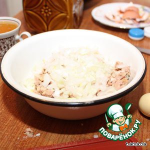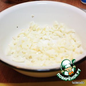 Дальше берем сырую луковичку, небольшую... мелко ее нарезаем.. кто не любит резкий запах лука, высыпьте нарезанный лук в дуршлаг и полейте кипятком... запах и горечь уйдут, а сочность останется