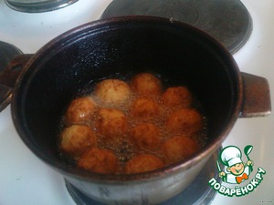Тесто брать по 1/2 чайной ложки, катать маленькие шарики и кидать во фритюр