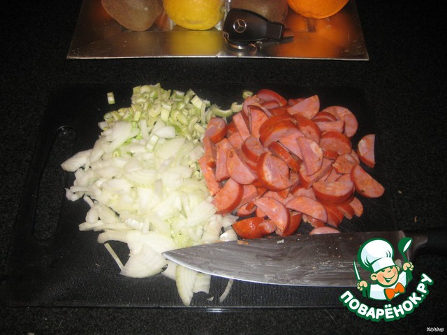 Нарезать сардельки/колбаски, лук, сладкий перец (я не добавляла), сельдерей. -