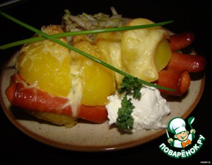 Второй вариант.. под сосиски положить кружок помдора.. посолить поперчить... посыпать сыром.. накрыть дольками картофеля.. Дальше тоже самое