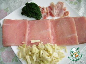 Яблоко и шпинат положить на край шницеля, сверху положить кусочек сырокопченого бекона. Накрыть вторым концом шницеля, складывая его пополам. -