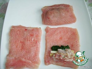 Грудку индейки нарезать на порционные куски по 100 гр, слегка отбить, поперчить, посолить.