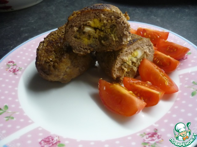 От фарша отрываем кусочек и разминаем его на ладони в лепёшку, кладём в середину начинку и, соединив края, лепим как котлету.