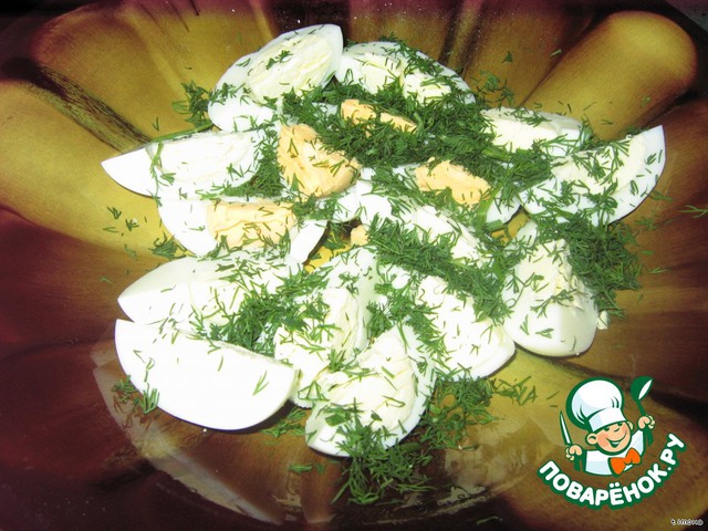 Вареные яйца нарезать ломтиками (я резала на 4 части).