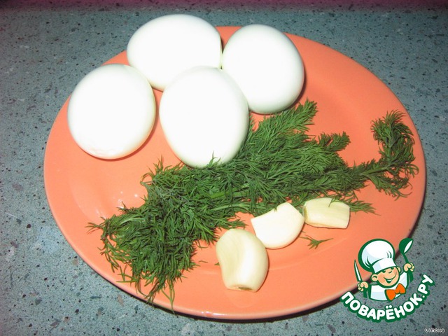 Отварить яйца, подготовить зелень (измельчить) и чеснок.