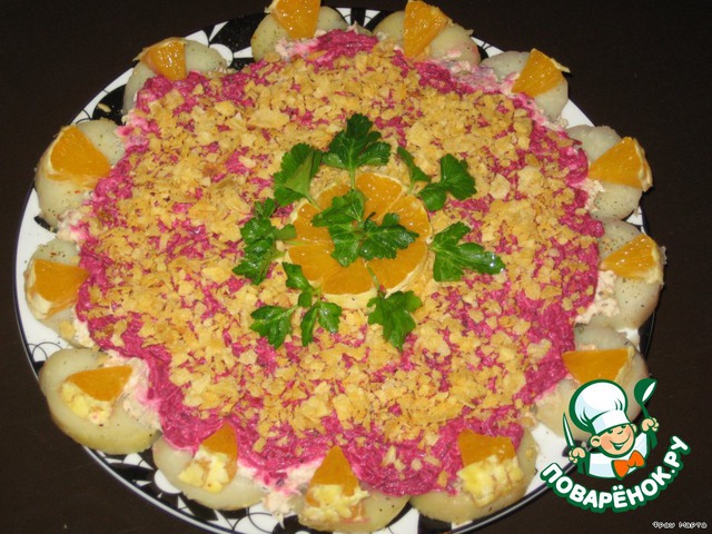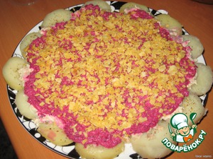 Чипсы (я брала со вкусом лука) покрошить и посыпать сверху на свеклу.