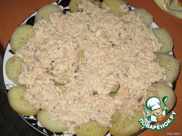 Рыбную консерву в собственном соку помять вилкой (сок слить), добавить немного майонеза, выложить сверху на картошку.