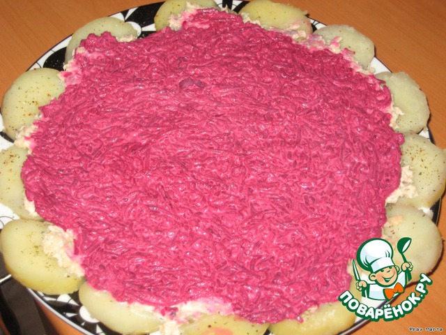 Отварную свеклу потереть на крупной терке, добавить майонез и выложить сверху на рыбу.