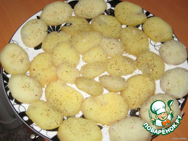 Картофель отварить в мундире, остудить и нарезать кругами. Выложить на блюдо, поперчить и слегка присолить.