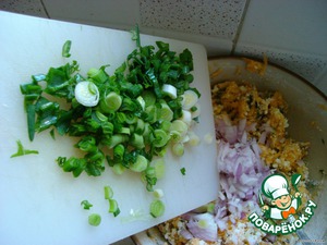 А пока режем мелко лук, укроп, добавляем тёртый сыр.