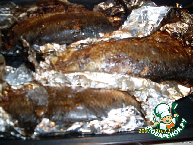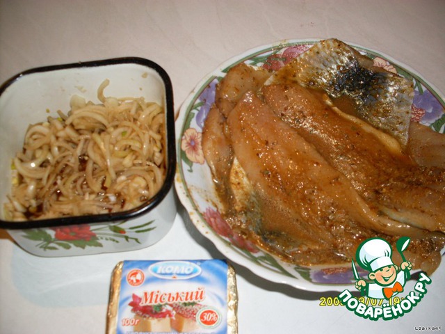Маринованный лук смешать с тертым сыром и зажаркой из орехов. Зафаршировать рыбку (фотка не получилась), завернуть в фольгу, уложить на противень и поставить в разогретую духовку минут на 30.