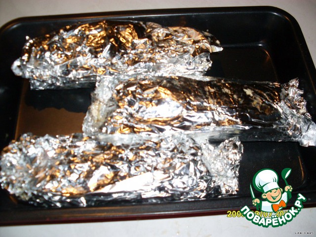 Разрезать фольгу и дать рыбке зарумяниться (можно смазать слегка майонезом)