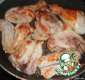 Сюда же кладем наши кусочки курицы и обжариваем их.