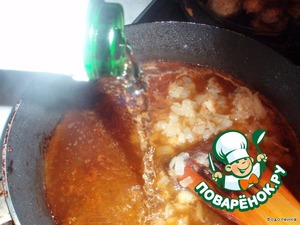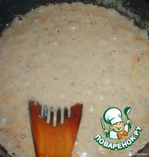 Когда вино выкипет (где-то через 5 минут) льем еще немного вина, тогда еще пять минут, опять льем и т. д. На дне начнет собираться соус, который нам будет нужен.