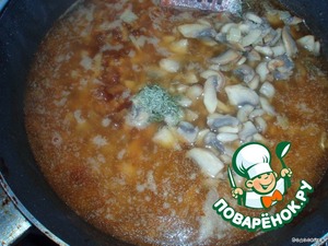 После добавляем наш лук, грибы и 1 ч. л. чабреца (тимьяна).