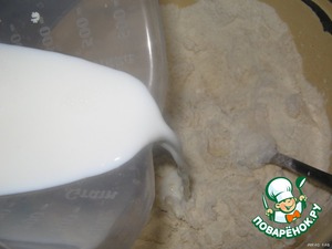 Выливаем в миску с пшеничной мукой оставшиеся 100 мл молока, а в другую - оставшуюся воду 120 мл.