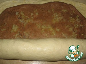 Тёмный пласт накрутить на скалку и перенести на белый, уложив поверх сыра. Посыпать тмином и жареным луком.