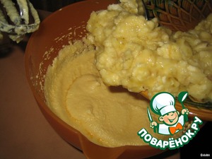 Затем добавить бананы вместе с солью, ванильным сахаром, имбирем и корицей в масляно-яичную смесь.