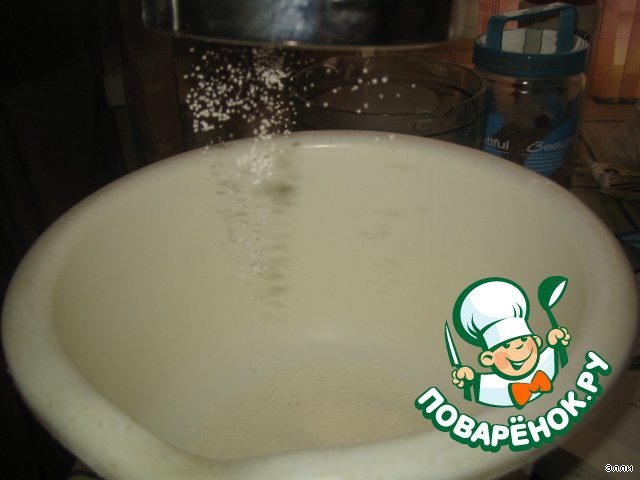 Муку смешать с разрыхлителем и просеять.