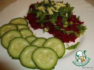 • Лук мелко режем, обжариваем на растительном масле. Добавляем потертую на крупной терке морковь и снова обжариваем. Далее идет тертая на крупной терке свекла. Добавляем ее в сковородку и обжариваем все вместе. Разводим в половине стакана воды кетчуп, соль и перец и выливаем в сковороду. Тушим, помешивая, под закрытой крышкой.